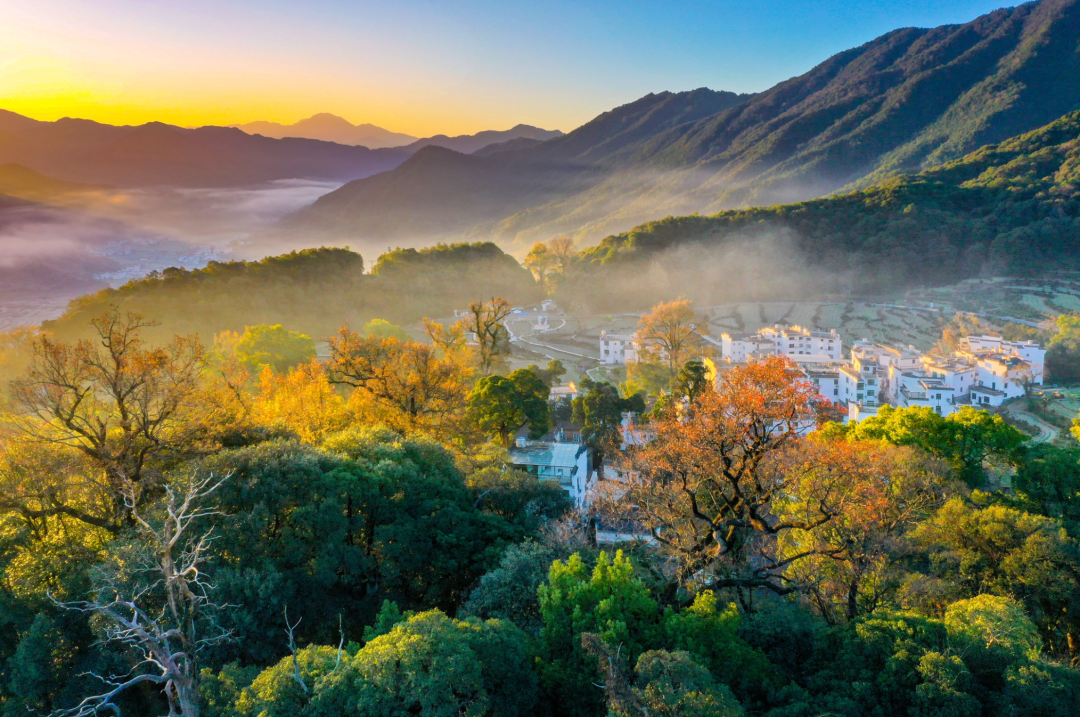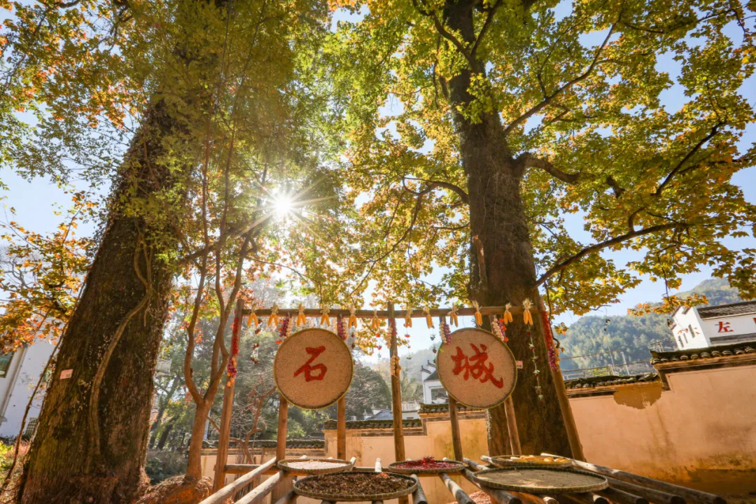 赏枫圣地、告白之城——石城。村内外有许多古树名木,有600年的枫香、800多年的香榧,其中让人惊叹的就是这里的百来棵枫树,每棵树高都在35米以上,远远超过村里的高矮屋顶,和巨大而且笔直向上的树冠相比,黑瓦白墙像玩具屋子。枫树林中还, 有山樱花、楠木、红豆杉、杭州榆、糙叶树、青栲、槐树等混杂其间。