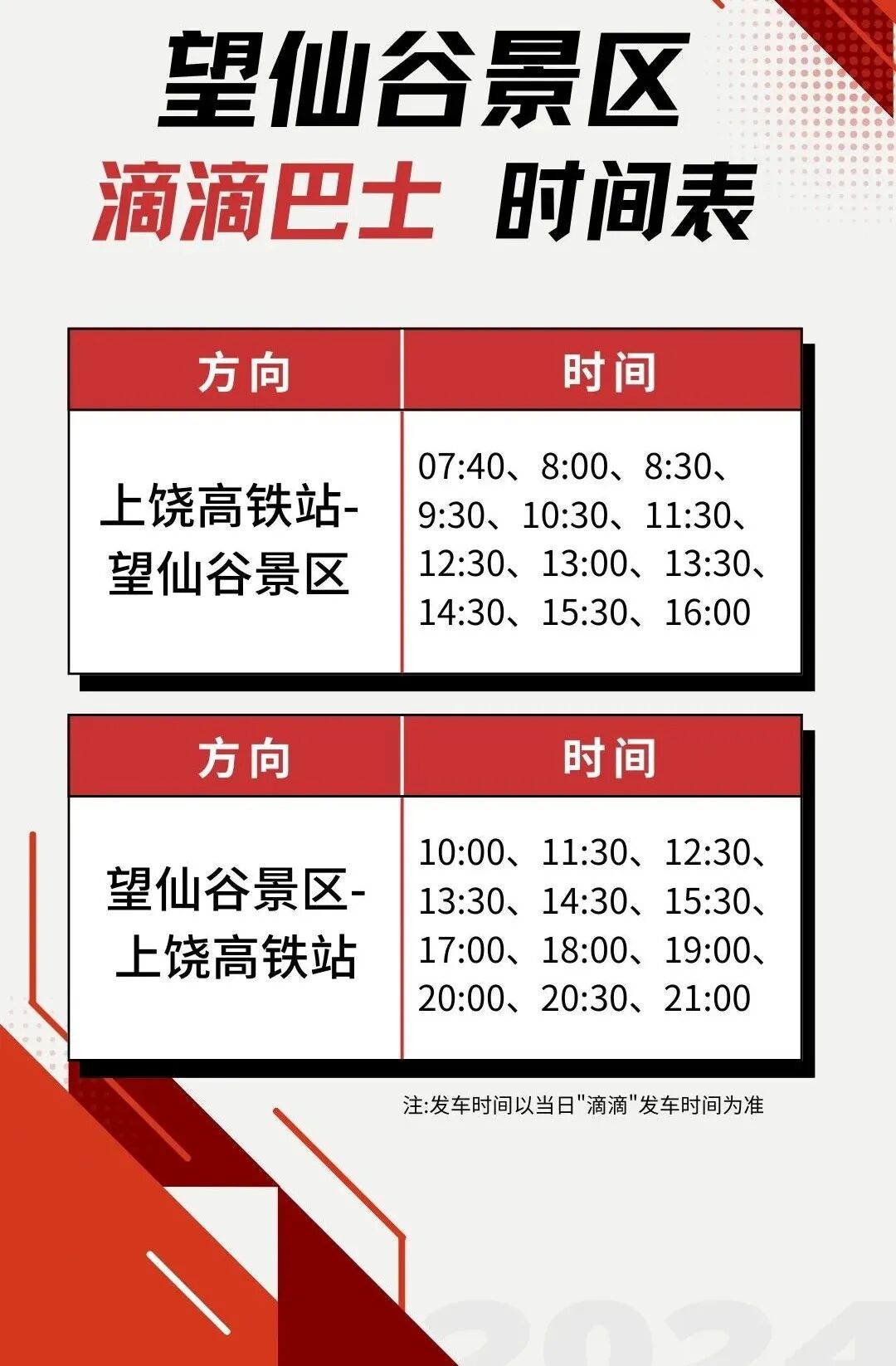 上饶高铁站——望仙谷游客中心 07:40、8:00、8:30、9:30、10:30、11:30、12:30、13:00、13:30、14:30、15:30、16:00 望仙谷游客中心——上饶高铁站 10:00、11:30、12:30、13:30、14:30、15:30、17:00、18:00、19:00、20:00、20:30、21:00