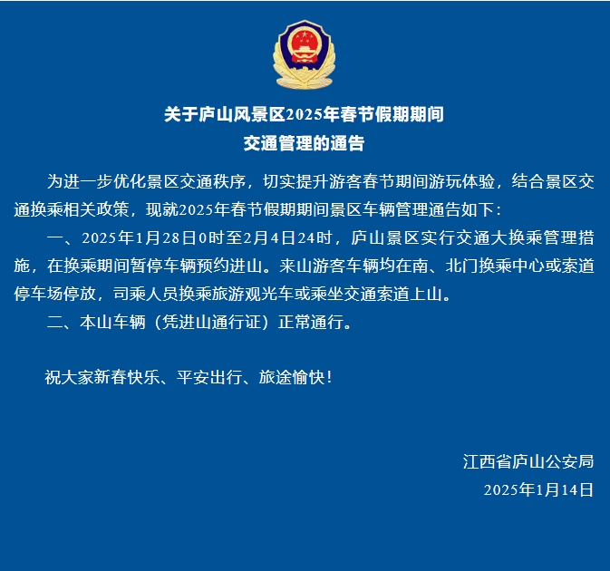 关于庐山风景区2025年春节假期期间交通管理的通告