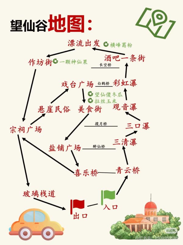 游客中心-青云桥-三清瀑-观音瀑-彩虹瀑-醉仙街-揽月桥-百味街-杨府广场-若谷街-万三书舍-鸣蝉巷-长空桥-回程栈道-百舸桥-作坊街-胡氏宗祠-灵光街-迷津口-玻璃栈道-小飞侠乐园