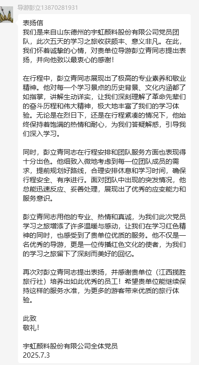 我们是来自山东德州的宇虹颜料股份有限公司党员团队,此次五天的学习之旅收获颇丰、意义非凡。在此,我们怀着诚挚的心情,对贵单位导游彭立青同志提出表扬,并向他致以最衷心的感谢!