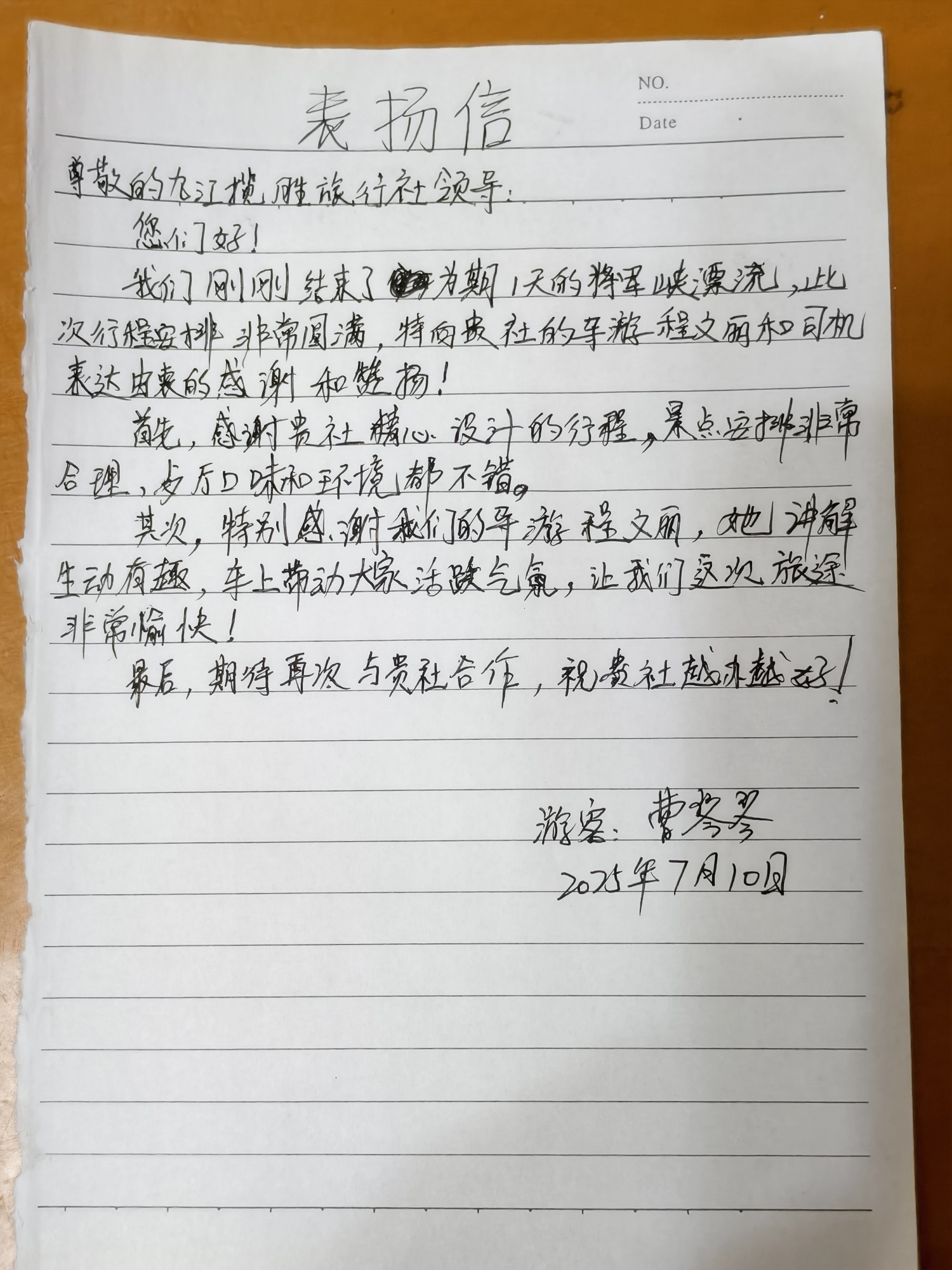 - 江西漂流之旅好评!九江揽胜导游程文丽及司机获感谢