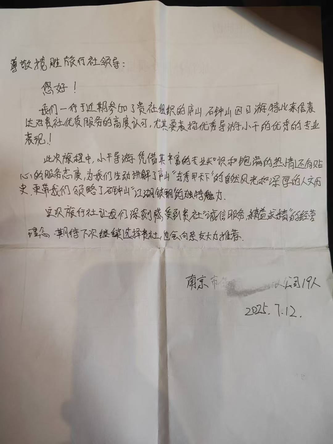 我们一行于近期参加了贵社组织的庐山、石钟山四日游,特此来信表达对贵社优质服务的高度认可,尤其要表扬优秀导游小干的优秀专业表现!