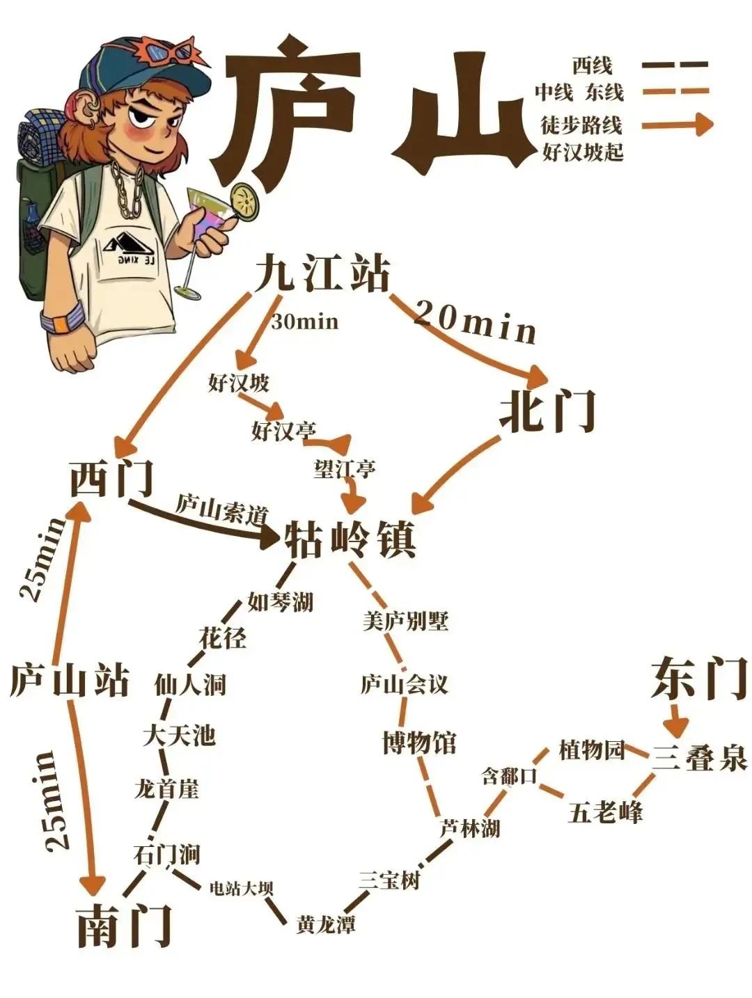 路线:东门→三叠泉→五老峰→含鄱口→芦林湖→博物馆→庐山会议→美庐别墅→牯岭街