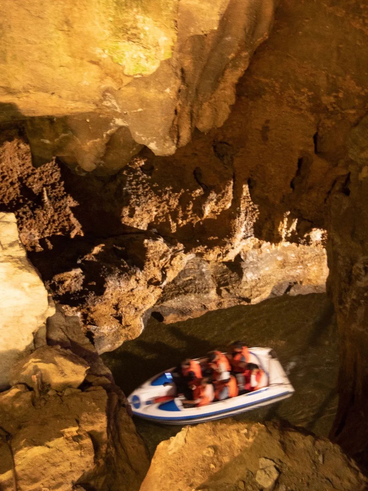 乘一艘小船穿过地下暗河,两侧石幔如垂帘擦着船身掠过。学着小猪妖在悬崖呐喊的姿态,对着幽深的洞道喊一声。此刻你与它一样,在荒诞现实中走出了自己的“取经路”。