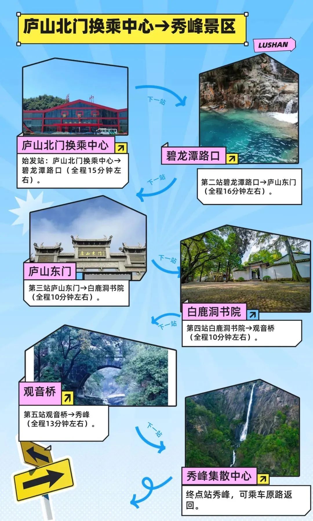 线路一:庐山北门换乘中心——碧龙潭——庐山东门(三叠泉)——白鹿洞书院——观音桥——秀峰